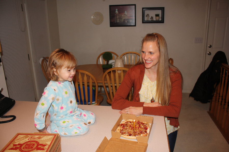 So I had a birthday, and I started the day off right with a Zumba workout and a shower. To conclude the day, I got to pick the restaurant we ate at. I chose Texas Roadhouse, I chose steak and shrimp, and I chose NOT to sit on the birthday saddle and make a fool of myself. No bag of peanuts is worth the humiliation. When we came home, Jason had opted to do something a little different than cake, so we had dessert pizzas from Brick Oven. They were delicious. Ella helped me blow out the candle. We figured she needed some practice for her big day in a couple of weeks.